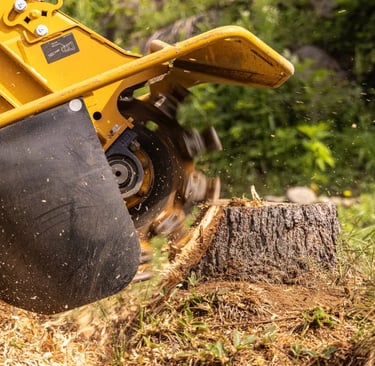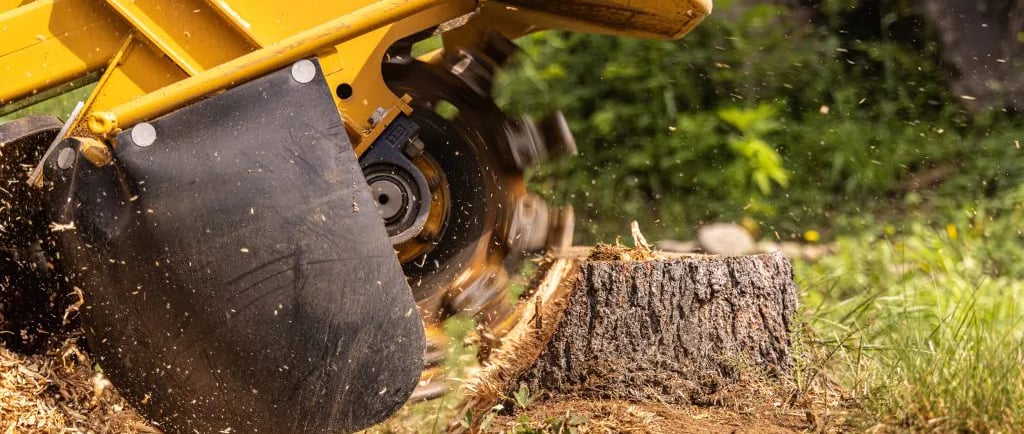 4-Extraction avec machines (mécanisée) : Pour les grandes surfaces ou les très grandes souches, on utilise des engins lourds (excavatrices) ou une débroussailleuse/broyeuse de souches, qui broie le bois sous le niveau du sol.